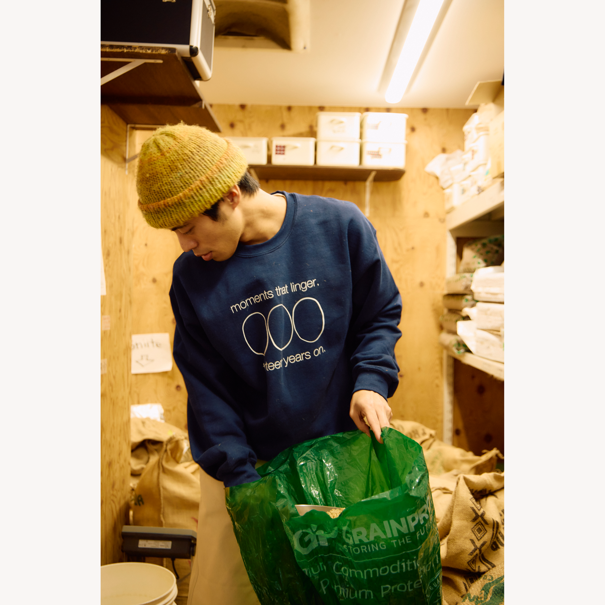 一杯のコーヒーを飲み終えた後に漂う香りや、心にそっと残る時間の静けさをイメージしました。3つの抽象的な楕円は、コーヒー豆と人の輪郭をモチーフにしています。
